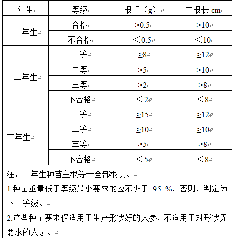 2.選苗 合格種苗應滿足以下要求:種苗的主根、側根、須根應完整.主根應飽滿、質地充實,人參種苗越冬芽應完整, 飽滿, 質地充實,不應檢出鐮刀菌、鏈格孢及線蟲。種苗重量應滿足表2要求。 表2 人參種苗分級標準